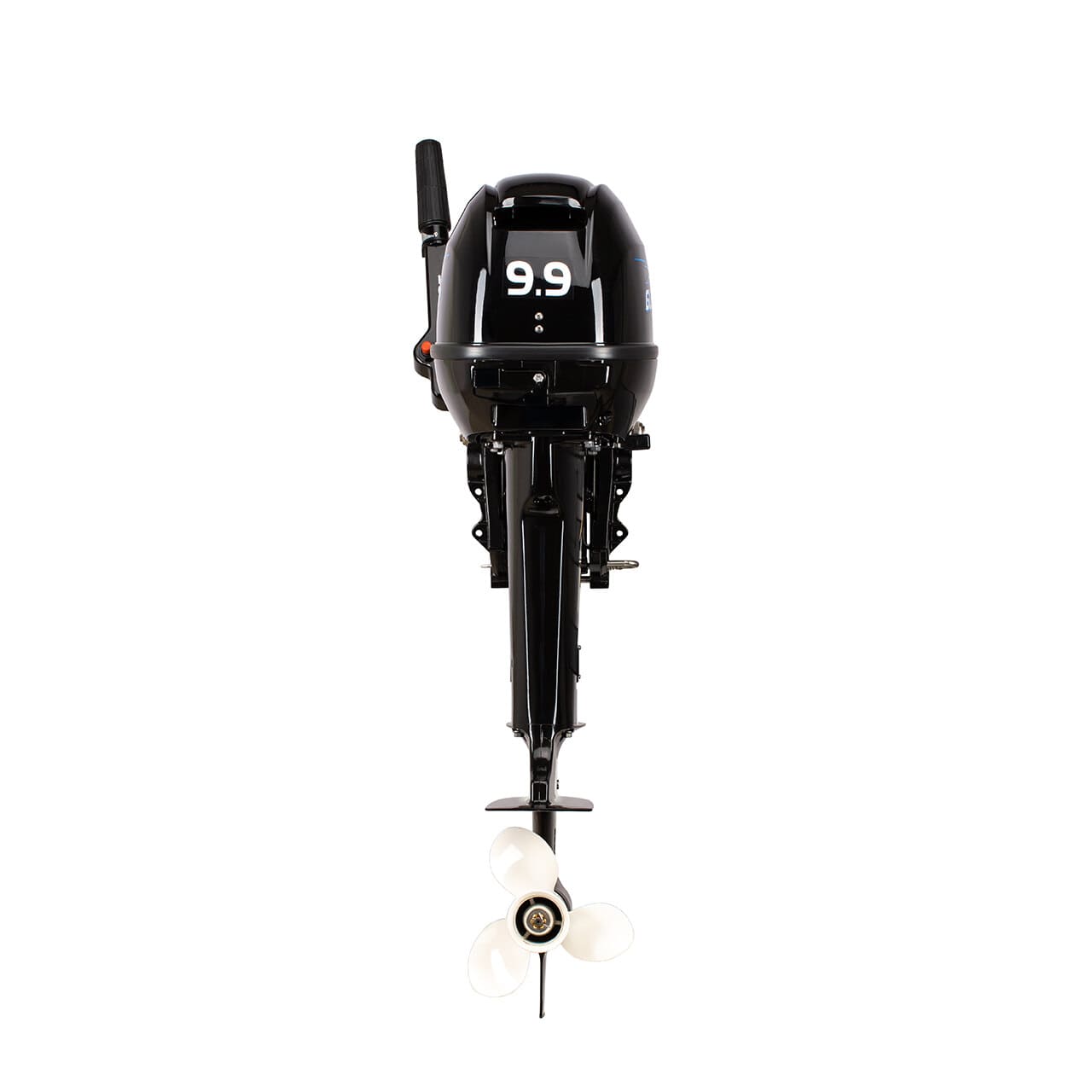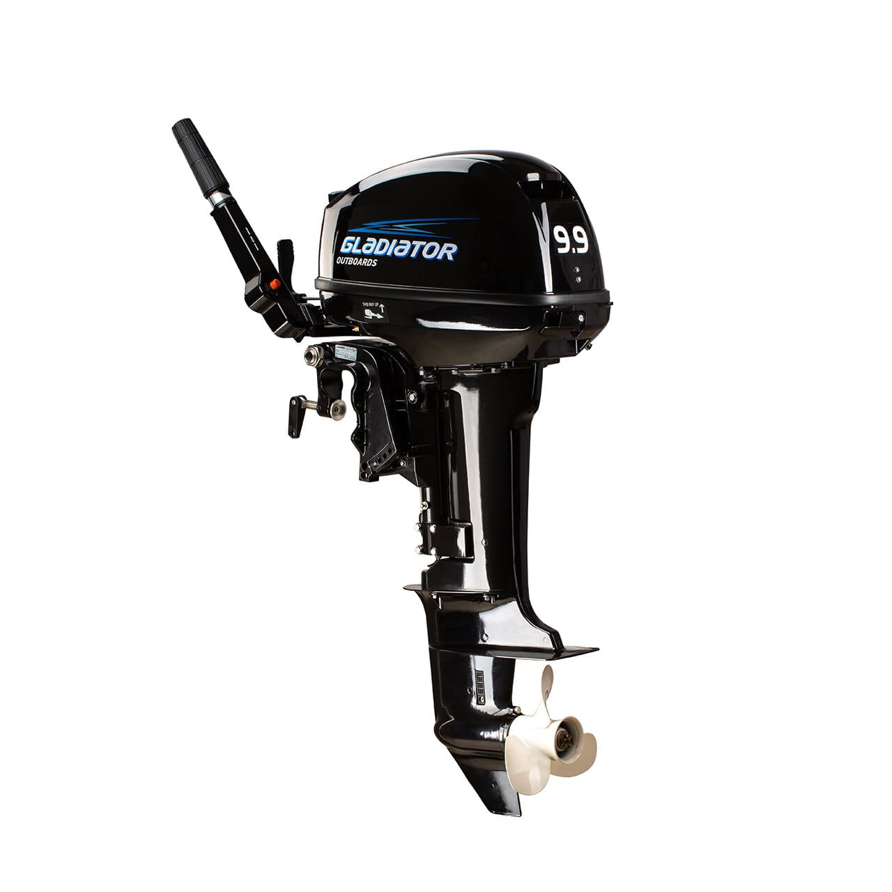 GLADIATOR G 9.9FHS — 2-х тактный подвесной лодочный мотор мощностью 15 л.с. Мотор питается от внешнего топливного бака, с которым соединяется топливным шлангом через быстроразъемные коннекторы (возможно переключение с одного бака на другой без выключения двигателя). В качестве топлива используется заранее подготовленная смесь (предварительное смешивание) в соотношении 50:1 (на 50 л. бензина — 1 л. масла). Для облегчения запуска холодного двигателя в конструкции карбюратора предусмотрена воздушная заслонка. Для контроля работы системы охлаждения на поддоне мотора установлена специальная форсунка. Для поддержания стабильной рабочей температуры двигателя в систему охлаждения встроен термостат. Мотор запускается ручным стартером и управляется стандартным румпелем с поворотной ручкой газа (гашеткой мотоциклетного типа) с антипроскальзывающими насечками.