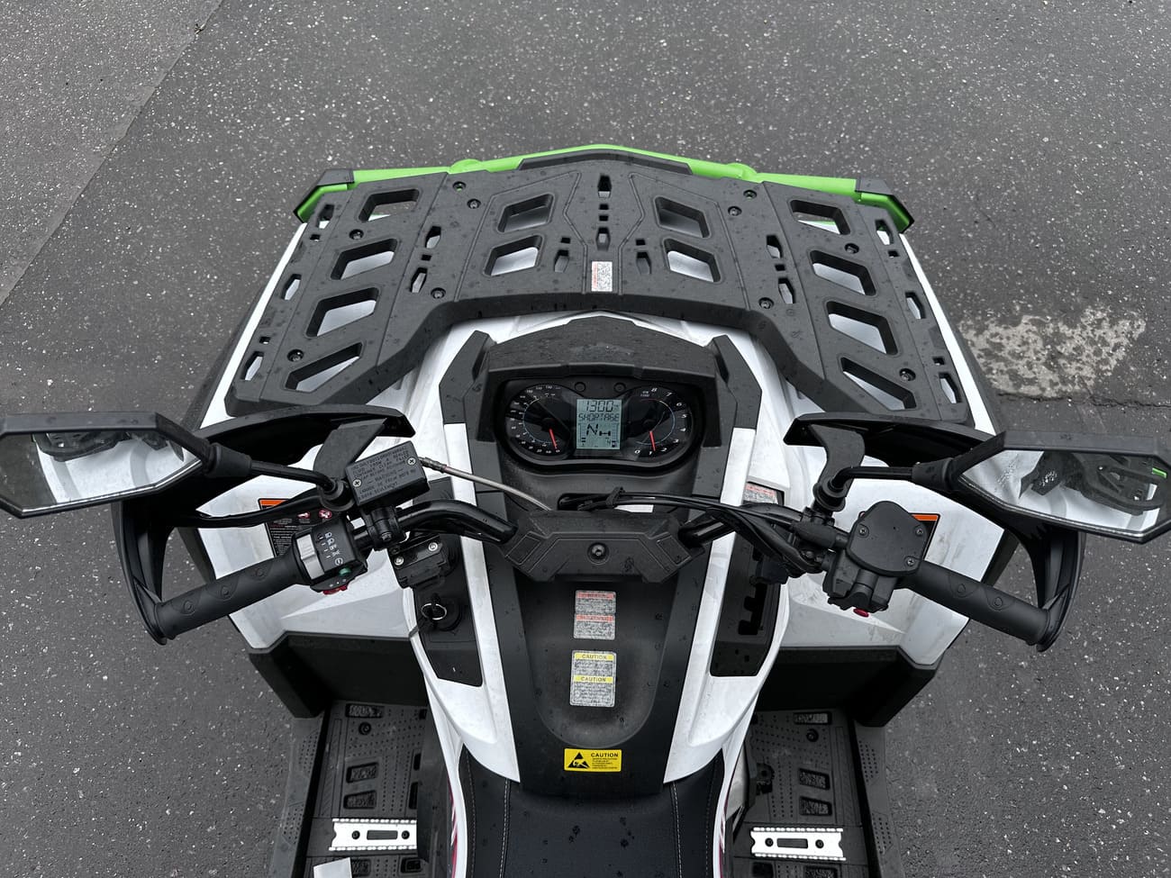 Понравилась система электронного управления мощностью, раньше не катал на квадриках с такой, действительно намного проще заезжать на склоны. Скорость хорошая, до 100 км/ч разгонял, мощный квадроцикл в общем. Из минусов пришел с разбитым зеркалом заднего вида