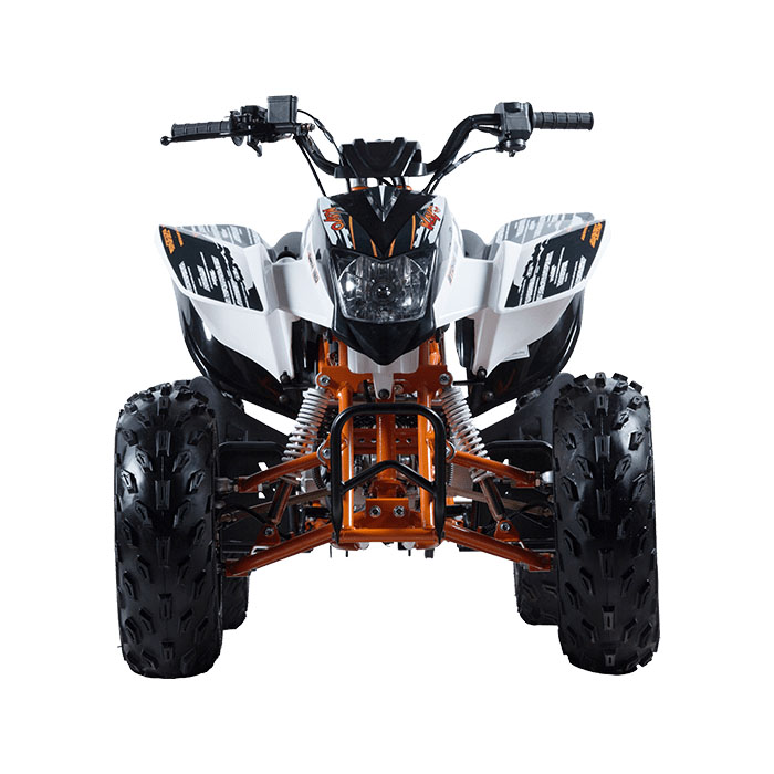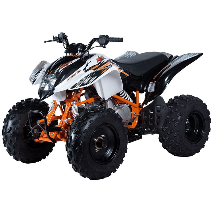 Kayo Storm – это детский спортивный квадроцикл, оснащенный 150-кубовым мотором. Учитывая мощность и габариты техники, данная модель подойдет для подростков. Станет отличным вариантом для обучения езде на мототехнике. Несомненным плюсом станет яркий спортивный дизайн, который точно не оставит вашего ребенка равнодушным. Также подойдет для взрослых, которые любят активный отдых и покатушки по бездорожью.Квадроцикл построен на стальной трубчатой раме, что позволило сделать конструкцию прочной и легкой. Спереди используется рычажная подвеска, а сзади расположился нерегулируемый амортизатор. Колеса стальные с внедорожной резиной. Такой набор гарантирует хорошую проходимость и комфорт во время внедорожных поездок.