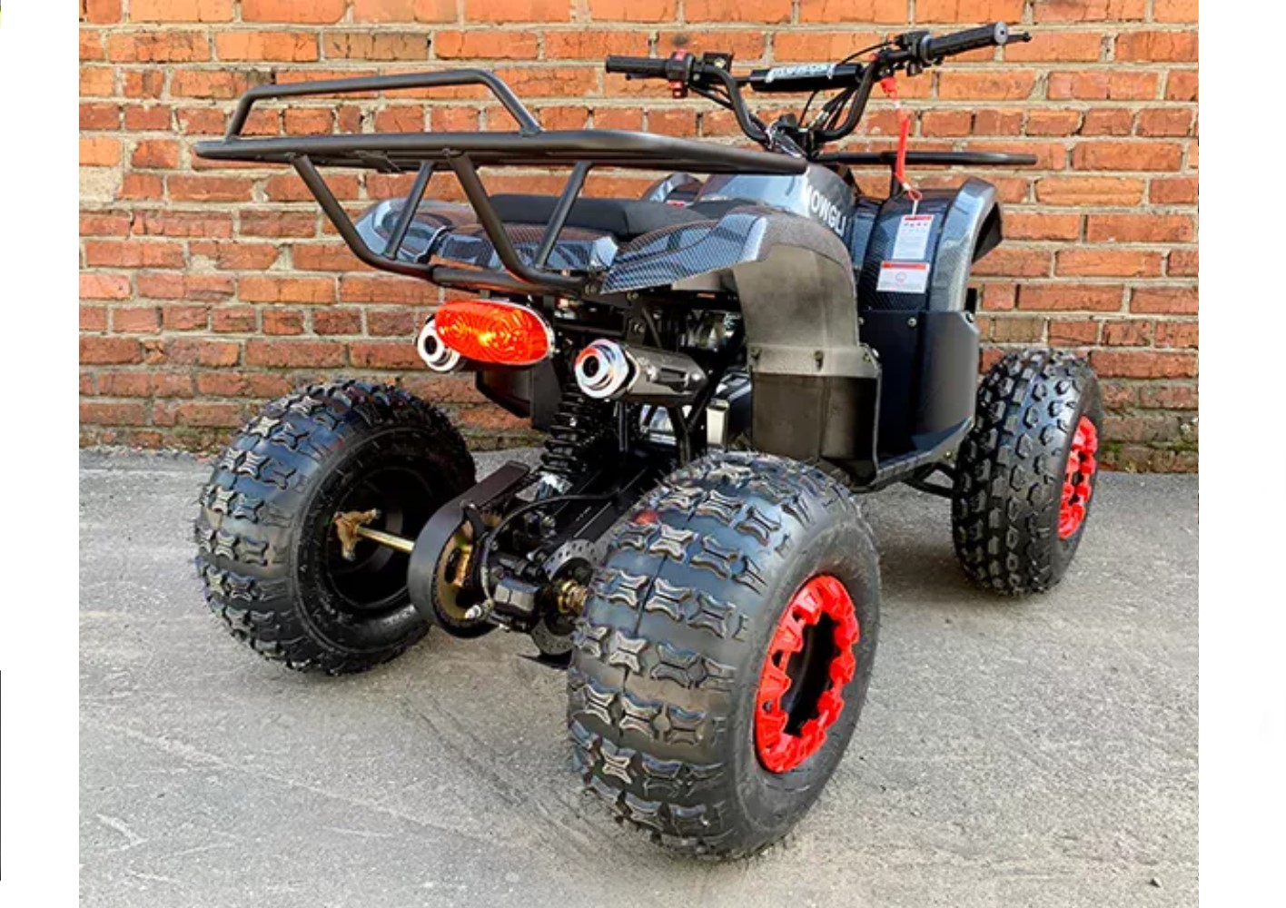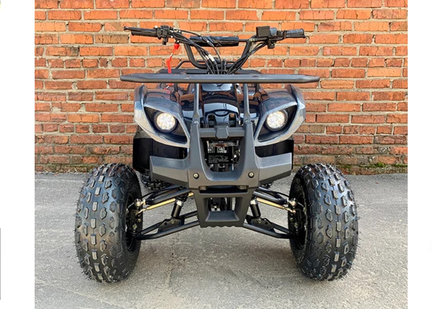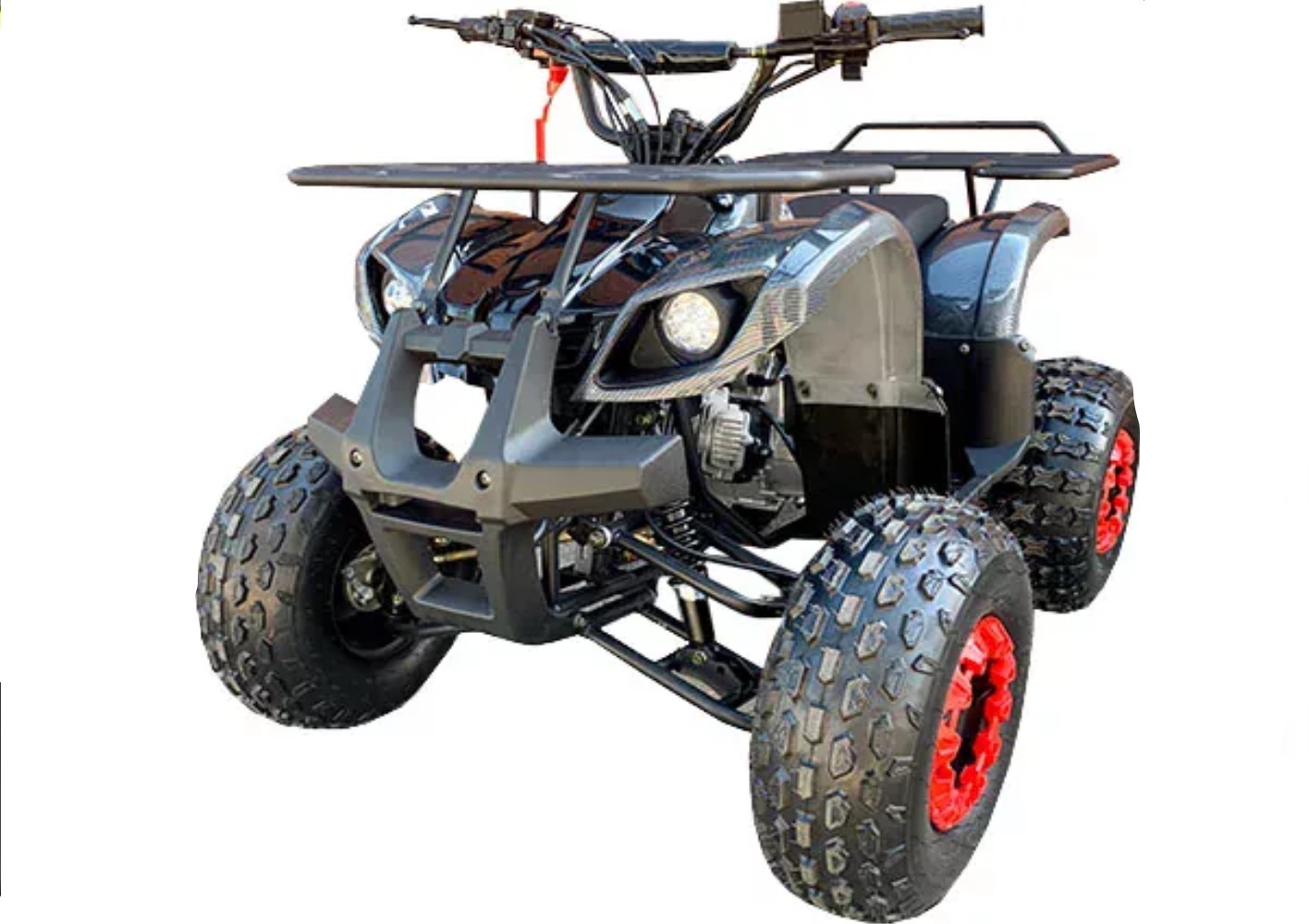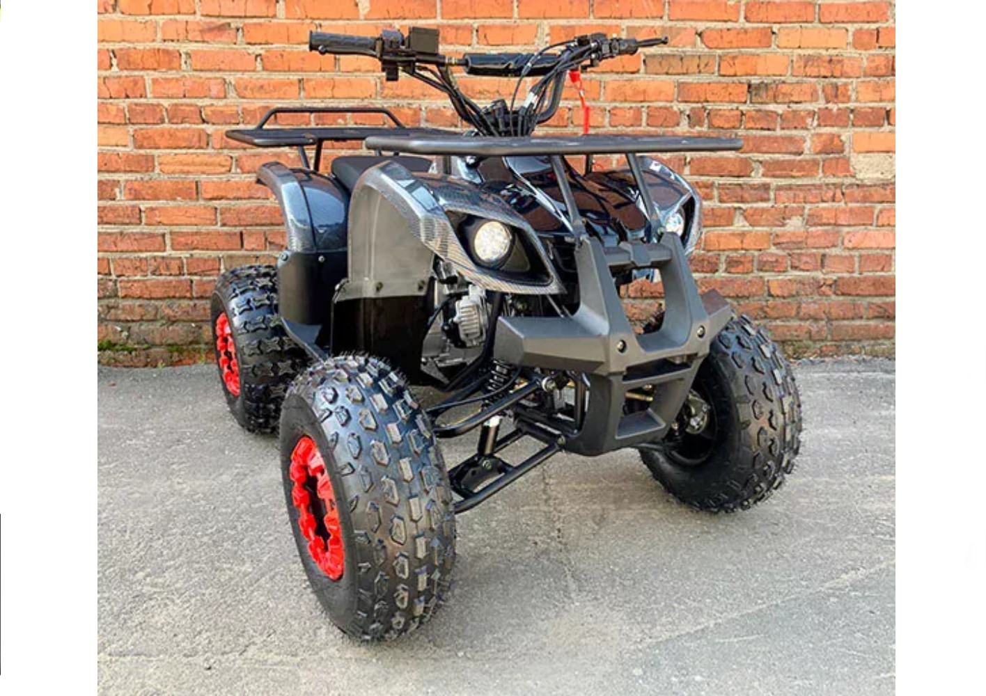 Квадроцикл оборудован мощным бензиновым четырехтактным двигателем на 49 кубических сантиметров, конструкция выдерживает нагрузку до 120 кг. Диаметр колес 8 дюймов, они идеально приспособлены для передвижения по грунтовым дорогам, песку или траве.