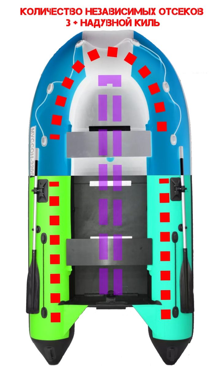 Муссон 3200 СК - безопасна, один случайный прокол может остаться даже незамеченным. Большой баллон (43 см) разделен на три изолированных надувных элемента. В комплексе с надувным килем такая конструкция обеспечивает повышенную плавучесть и грузоподъемность. Каждая камера снабжена своим воздушным клапаном. При повреждении одного надувного элемента судно обеспечит Вам безопасность за счет остальных. Хотя повредить современный ПВХ проблематично. И днище, и борта Муссон 3200 СК выполнены из многослойной ткани плотностью 900 г/м с армированием. Материал устойчив к проколам и порезам, не выгорает на солнце, остается эластичным на морозе, не преет и не гниет от тепла и сырости.