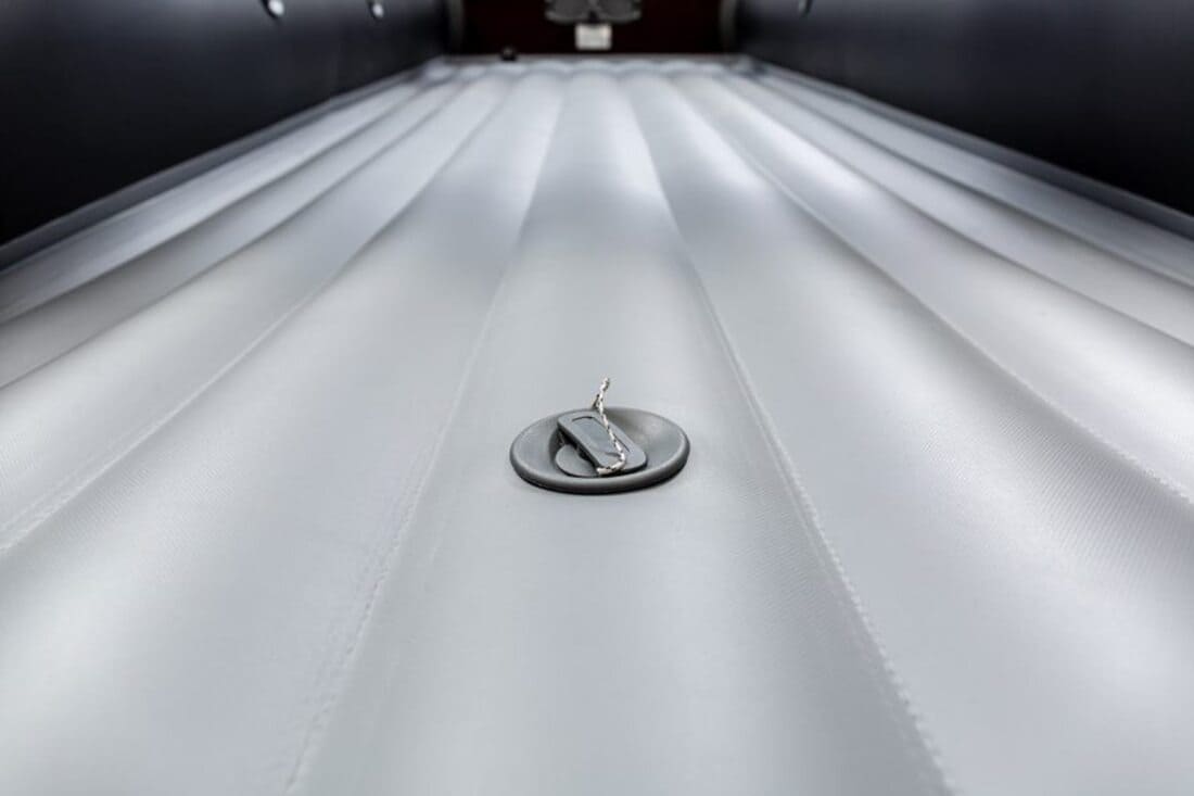 - Надувное дно низкого давления — НДНД. Лодка полностью готова к использованию за 20 минут работы ножной помпой (или до 10 минут — электрическим насосом). Надувное дно уменьшает осадку лодки и позволяет легко проходить пороги и мелководные участки. При движении надувное дно не прогибается, обеспечивая хорошую мореходность и смягчает (амортизирует) удары волн, повышая комфорт пассажиров. Являясь дополнительным воздушным отсеком, дно увеличивает грузоподъёмность и надёжность лодки.