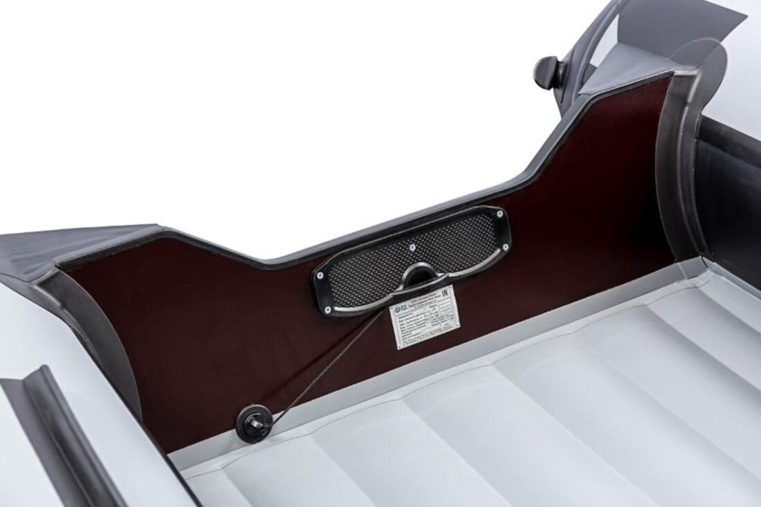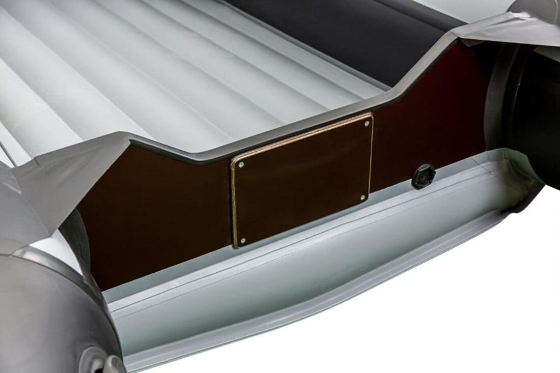 - Жёсткий встроенный транец из водонепроницаемой фанеры толщиной 24 мм. с двумя накладками — позволяет использовать подвесной мотор до 18 л.с. Транец оборудован сливным клапаном. Косынки из ПВХ между транцем и баллонами защищают кокпит от попадания брызг от мотора.
