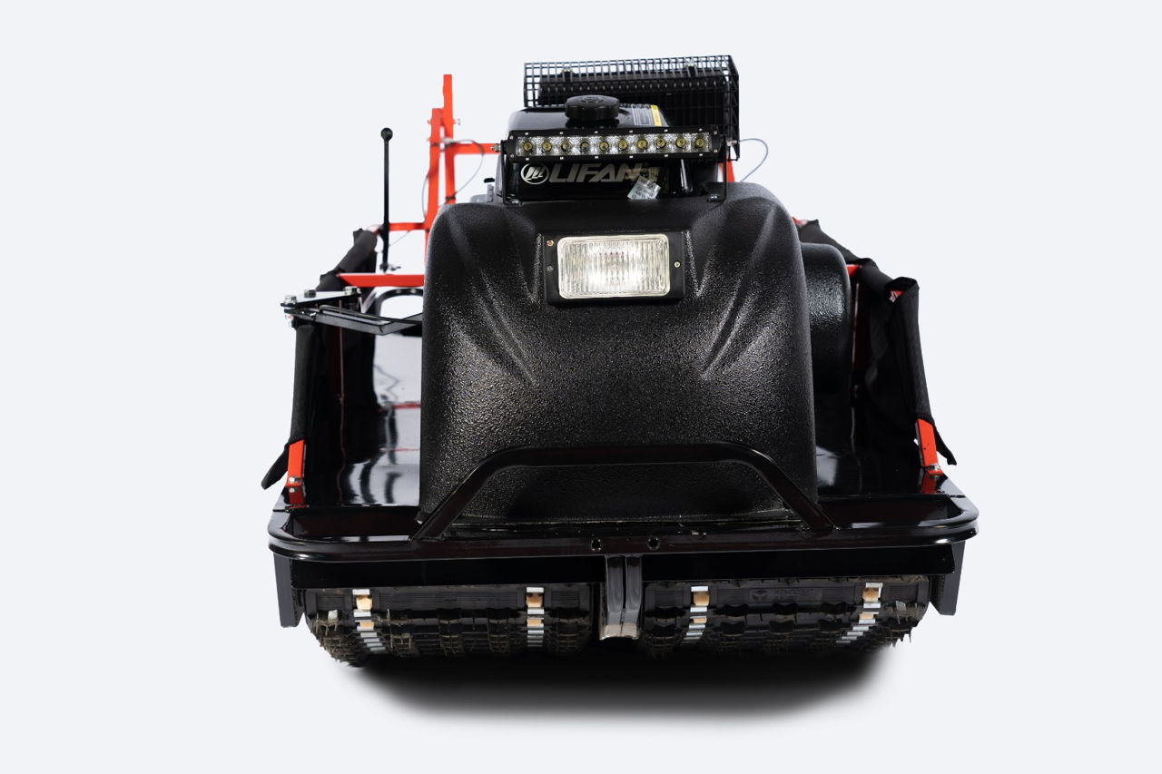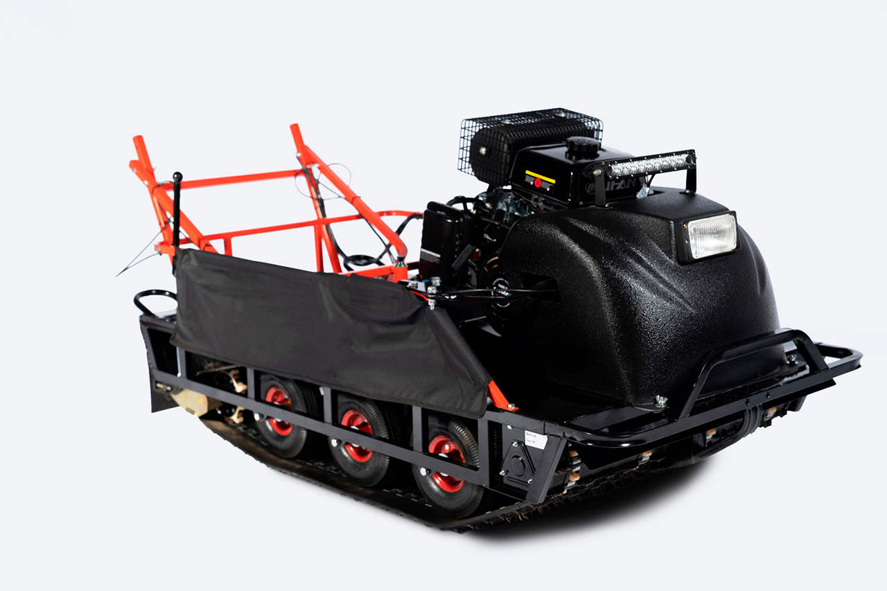 Мотобуксировщик БУРЛАК-М ЭКСПЕДИТОР 18.5 л.с. предназначен для езды по самым непроходимым дорогам. Мощное гусеничное шасси (ширина 1 гусеницы = 38 см) перерабатывает любой снег, грязь, песок, удерживает машину от скольжения на льду. При этом мотособака оставляет большое пятно следа, что позволяет «утонуть» в рыхлом снегу. Для стабильного движения предусмотрен толкач.