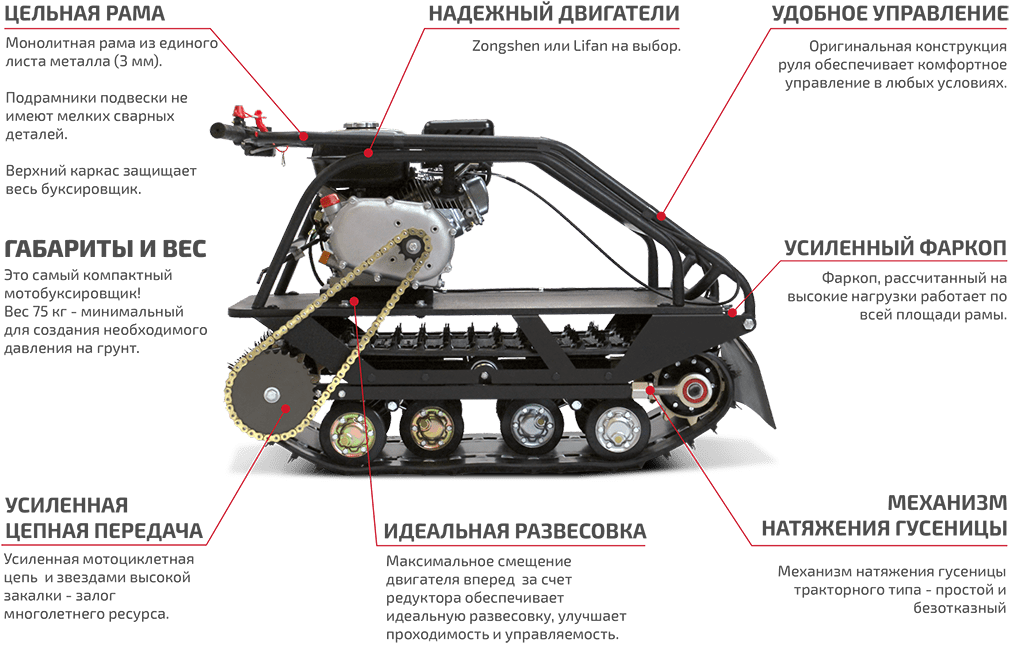 Всем, кто не представляет зиму без охоты, рыбалки и прогулок за городом, но не имеет большого гаража для хранения, стоит купить мотобуксировщик НОРКА 380 MINI 8 л.с. Этот компактный (длина = 1 м) аппарат стойко выносит низкую температуру и легко проходит там, где привычный автомобиль точно застрянет. Этому способствуют гусеницы Composit шириной 38 см, обладающие хорошим сцеплением и высокой проходимостью. Мотособака не уступает в эффективности более мощным моделям благодаря филигранной развесовке и балансу.