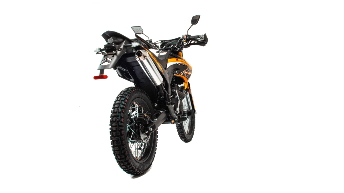 Motoland BLAZER 250 - отличный эндуро-мотоцикл по доступной цене. Имеет двигатель CBB 250, мощностью 17 л.с., усиленную «перевернутую» переднюю вилку, защиту двигателя и рук, LCD-панель, USB-разъем для зарядки мобильных устройств, светодиодные поворотники и стоп-сигнал и кроссовую фару. Переднее колесо 3.00-21, заднее колесо 4.00-18.мотоцикл двойного назначения – для асфальта и легкого бездорожья.