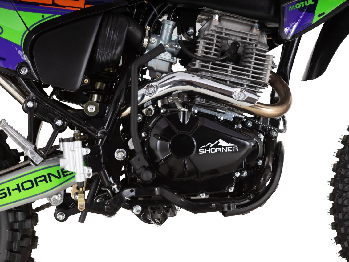 Сердце Shorner 280 R — двигатель модели 172FMM-5 (PR250) с балансировочным валом. Его объём — 250 см³, а мощность — 21 л. с. Благодаря воздушному охлаждению и карбюратору PZ30, двигатель работает стабильно и эффективно в любых условиях. Запуск осуществляется с помощью электростартера или кикстартера, что делает эксплуатацию мотоцикла удобной и простой.