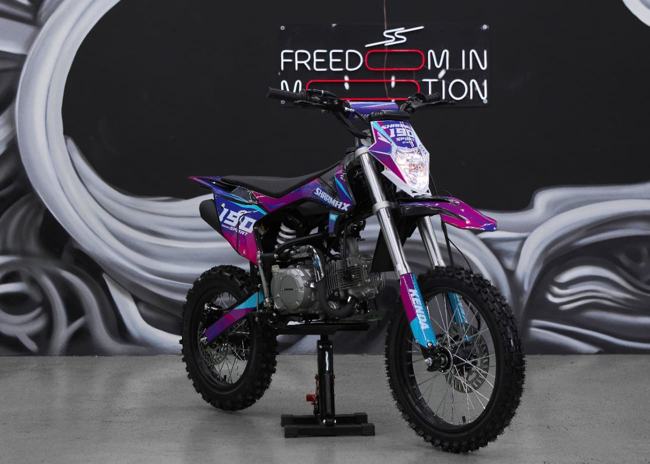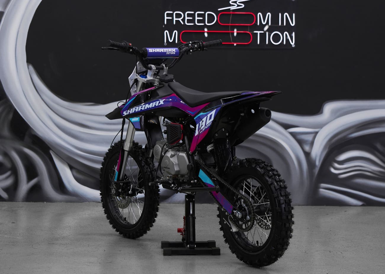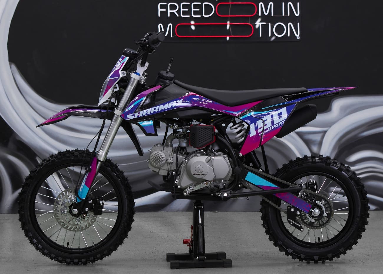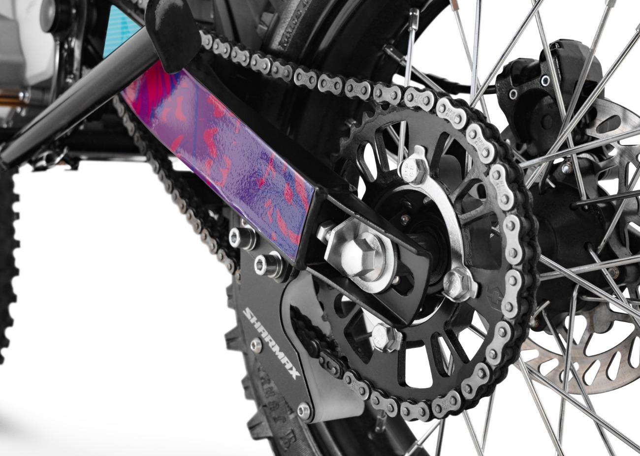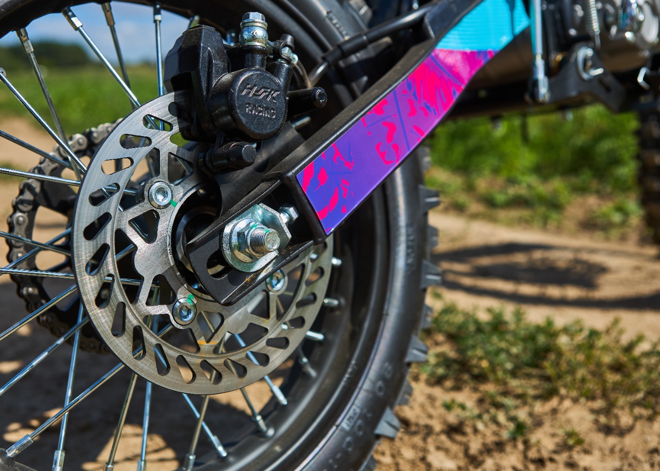 Удлиненная колесная база 1220 мм увеличивает устойчивость питбайка и позволяет гонщику комфортно держаться даже на раскисших от дождя дорогах. Диаметр колёс составляет 17/14 дюймов.