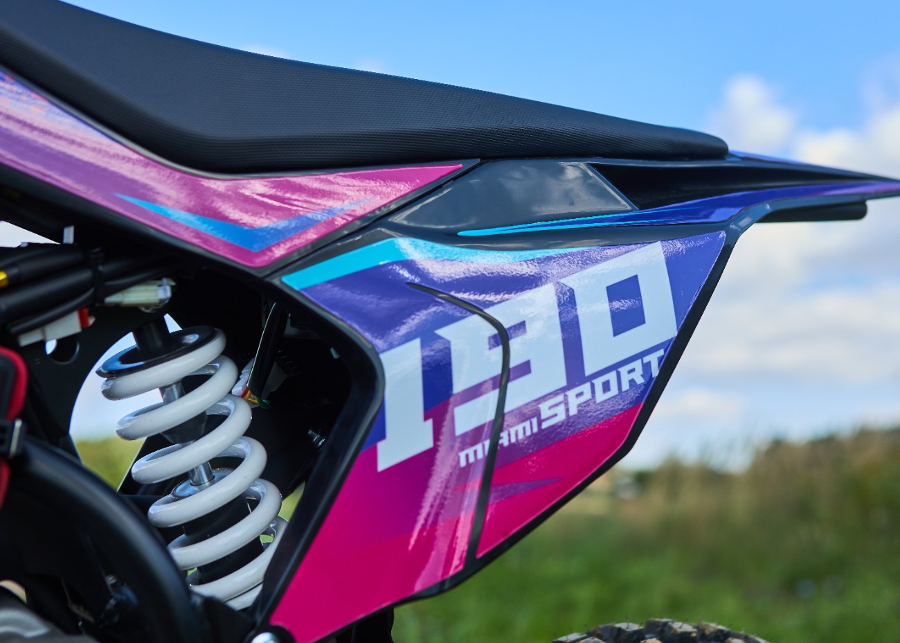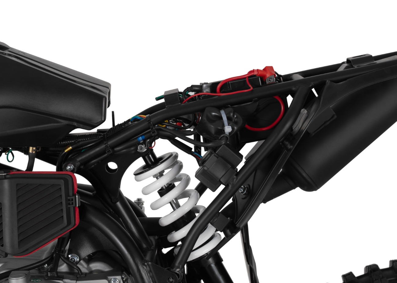 Задняя подвеска (диаметр штока 12 мм) с регулировкой преднатяга пружины помогает питбайку не вилять на поворотах и стабильно проходить все сложные участки трассы. Стальной маятник изготовлен из надёжного хромомолибденового сплава.